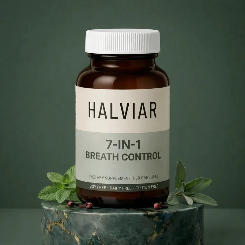 Halviar's 7-in-1 Advanced Breath Restoration Formula targets the real cause of bad breath deep in your gut — so you stay fresh all day, every day.